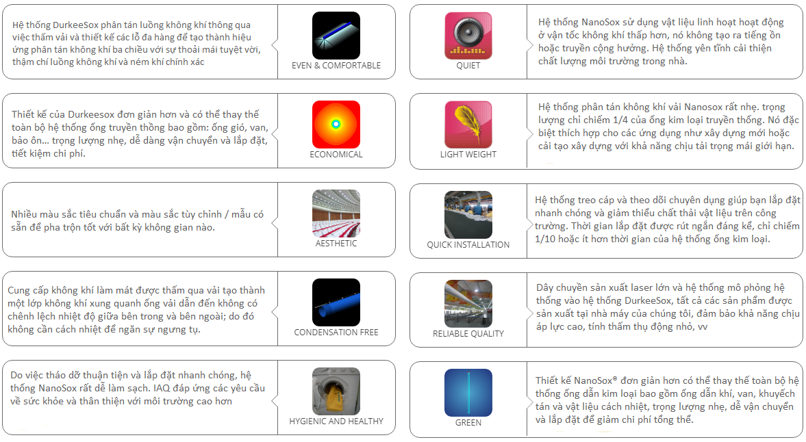 Theo vật liệu, ống gió vải Durkeesox bao gồm ba dòng: Nanosox- (NN Series), Nanosox-L (NL series) và Nanosox-F (NF series).